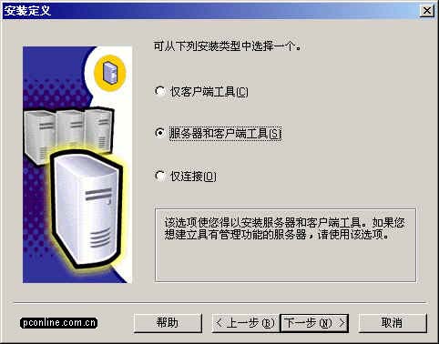 在 "安装定义"窗口,选择 "服务器和客户端工具" 选项进行安装。我们需要将服务器和客户端同时安装,这样在同一台机器上,我们可以完成相关的所有操作,对于我们学习SQL Server很有用处。如果你已经在其它机器上安装了SQL Server,则可以只安装客户端工具,用于对其它机器上SQL Server的存取。